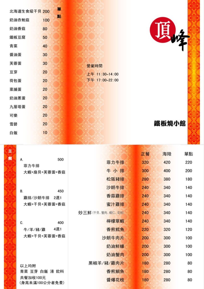 【頂峰鐵鈑燒】給您最精緻美味的鐵板料理,保留新鮮食材的原味與鮮甜,口感更是一流,給您從未體驗過的鐵板燒饗宴。